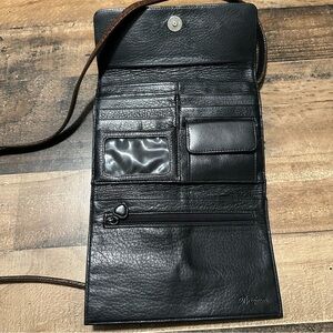 Dark brown croc embossed leather with dual flaps on either side. Multiple pockets & slots. Strap is removable to create a clutch or wallet. Beautiful silver hardware, a signature sign on Brighton bags.