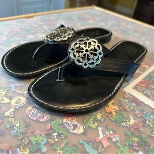 Brighton black sandals with striking silver emblems on the front. Durable leather construction. Classic black with high contrast white stitching.