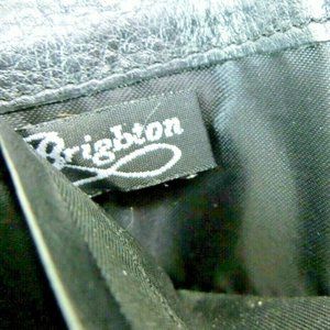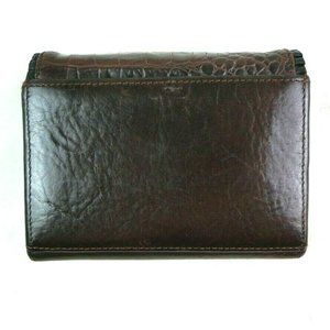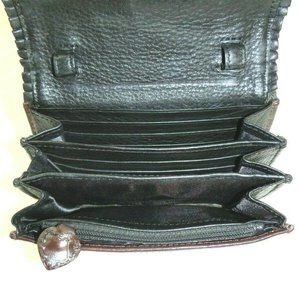 This sale is for a very classy and fun Brighton wallet. Brown leather with croc embossed accents, black ruffled edges, and silver tone heart emblem. Black fabric interior. Has pen holder, 1 zipper pocket on interior, multiple compartments, and credit card slots. Has 1 exterior pocket. Buttons closed.