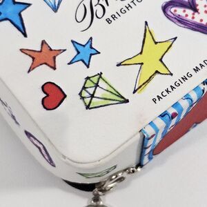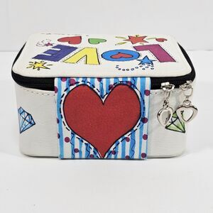 Fun and stylish Brighton compact travel jewelry organizer featuring vibrant hand-drawn inspired graphics of hearts, stars, and gemstones with bold coloring and whimsical designs by Tom Clancy. The zip-around closure keeps contents secure, with two heart-shaped silver-tone zipper pulls for glam detail. Interior is lined with soft black velvet and includes a stretch pocket for organizing rings, earrings, or delicate pieces. Exterior crafted from durable faux leather, featuring bright artwork and the iconic phrase. Light signs of use may include minor surface wear or tiny marks, overall clean condition with graphics and hardware intact. Ideal for collectors, gifting, or everyday use.Heart motif, graphic print, Tom Clancy design, travel accessory, jewelry organizer, Brighton collectible, faux leather, gift idea, whimsical, pop art, storage pouch, purse organizer, zipper case, multi-color, bold style, limited edition, compact box