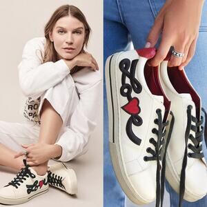 embroidered leather sneakers, love sneakers women, Valentine heart shoes, romantic streetwear, Brighton Fashionista collab, bold motif sneaker, designer-inspired trainers, giftable fashion shoes, luxe casual kicks, expressive footwear