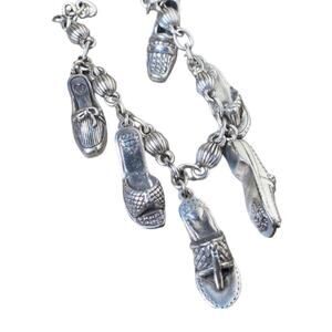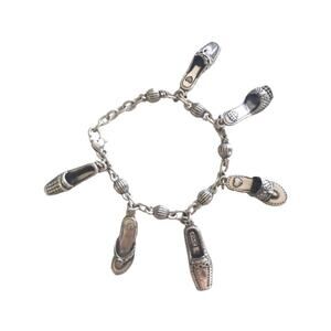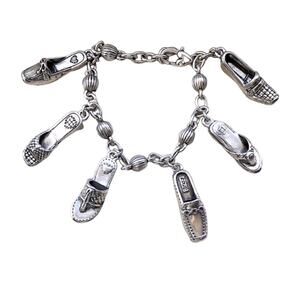 Brighton Shoe Charm Bracelet-Silver plated with 6 shoes, with Brighton stamped on the soles. Featuring a mule, slip on, thong, kitten heel and a penny loater and a sandal.
