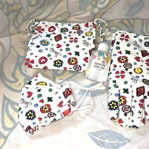 Designer Tom Clancy puts the love, sparkle, smiles (and safety) into your day with happy, colorful art on this mask-and-gloves set. The mask features an innovative tie design for complete coverage and a snug fit. It even comes with hand sanitizer and a matching pouch. Non-medical and reusable, our masks have a double layer. Please wash before first use, and after every wear.