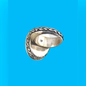 Silver-tone setting with a beautiful filigree pattern running down the center of the band and circling the setting. Center stone is a soft brown glass faceted stone. Multi-colored rhinestones surround the glass stone. Ring measures 1 1/8" long x 7/8" wide. Brighton signature "B" and heart stamped on inside of band. Comes in a Brighton Ring Box. NWOT