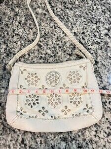 Brighton Masterpiece white leather floral cutout hand bag with shoulder strap. Bag has some wear on outer leather as seen in photos. Has alot of life left in this bag Zips across top all zippers works grate.