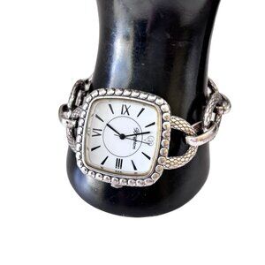 he Brighton "Milla" Silver Tone Watch with Etched Links features a stylish square face design, perfect for women who appreciate fashion and elegance. The watch is made with silver plated band material and a fold over clasp closure for a secure fit on the wrist. With an adjustable wrist size ranging from 8 1/2" to 9 1/2", this watch is versatile and suitable for various wrist sizes. The etched links add a touch of sophistication to this chic timepiece, making it a standout accessory for any outfit. Comes with new battery and Brighton gift bag.
