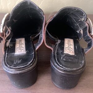Brighton Mules Leather Cap Toe Faux Buckle Brown Black Silver Western Size 7.5 Narrow. Uppers and buckle are in good condition. Please see photos for condition inside. Heel 1.75”