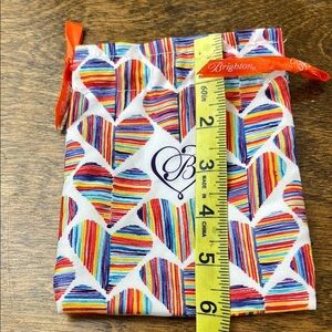 Charming drawstring pouch with multicolor heart design. Features Brighton branding and vibrant ribbon ties. Excellent condition. Measures 5 x 6”.