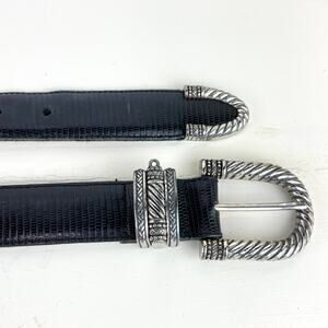 Vintage 90's black leather belt with embossed reptile texture. Measures approx 34" x 1.25"