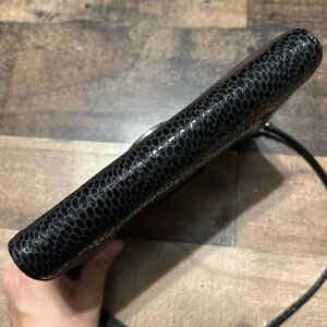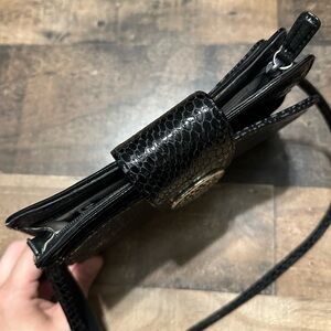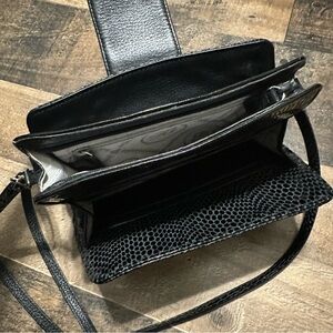 Excellent condition! Beautiful black python embossed leather. Silver buckle. Many interior compartments and pockets. Adjustable crossbody strap.