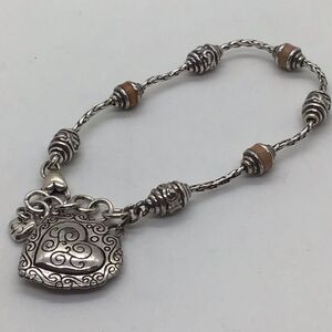 Pretty silver toned bracelet with pinkish beads and leather look heart. Good preowned condition as seen in photos.