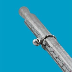This sophisticated silver ring showcases a lustrous pearl, adding elegance to any ensemble crystals on either side. Size 8