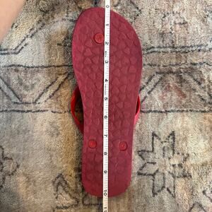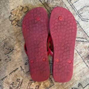 Super pretty pair of pink flip flops with floral print all over the sandals. They also have cool silver metal flower details on the thong of the flip flops. No flaws, gently used, great condition!