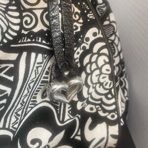Chic shoulder bag with vibrant poppy red floral design. Black and white pattern offers striking contrast. Perfect for any occasion. Lovely red lining inside with multiple pockets and zippered pouches for ample storage and organization of your essentials. Beautiful condition.