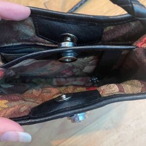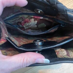 Small Brighton purse with cute metal accents and patterned interior fabric. Multiple pockets. Barely used. Really nice! See pictures for measurements.