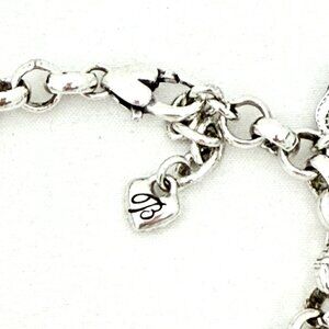 Brighton "I Love Designer Bags" charm bracelet. Retired braelet. Six double sided silver tone and enamel charms of various purse/bag designs. The bracelet would best fit between a size 6 and 6.75 (see photos on mandrel). Very good overall condition. Minimal to no wear noted on the chain finish. Brighton heart logo tag is attached to chain.