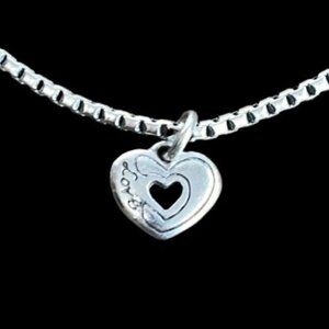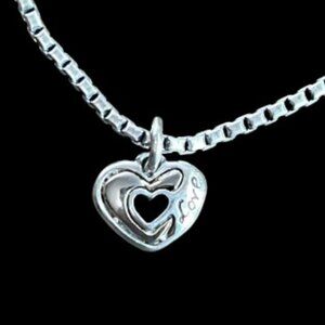 Silver box chain ankle bracelet with "Love" heart charm. Reversible heart says Love on both sides. One side is solid silver, the other has a swoosh of gold on silver. Adjustable length (9" - 10.5"). Lobster clasp closure. Excellent used condition. Comes with duster bag.