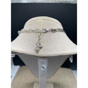 This stunning necklace from Brighton features a unique two-toned design with a double heart pendant. The silver and gold combination creates a beautiful contrast and is sure to catch the eye. The necklace consists of multiple strands that measure between 15-18 inches, making it a versatile piece that can be worn with a variety of outfits.