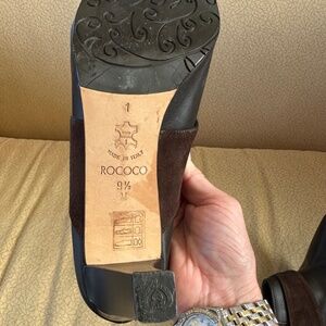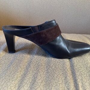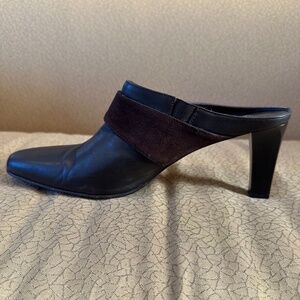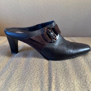 Beautiful chocolate brown leather mules, accented with rich suede trim and a chic tortoise shell decorative detail. These mules give you the stylish look of boots without the bulk, making them a perfect choice for cooler weather.