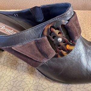 Brighton Rococo Brown Leather and Suede Mules With Tortoise Shell Trim
