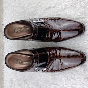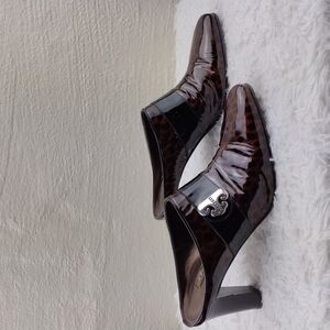 Brighton Runway Women's Black/Brown Cheetah Patent Leather Upper Pointed Toe High Heel Slide On Mule Shoes. Rubber Sole. Silver Faux Buckle Detail. Toe Tip Marks Per Picture. Measurement approx. Heel: 3". Size 8.5. Made In Italy. Like New Condition.