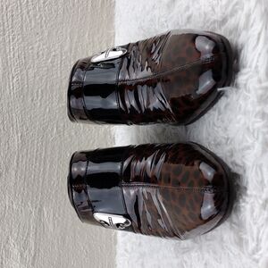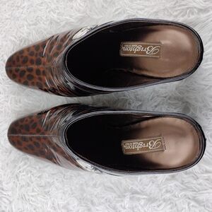 Brighton Runway Black Brown Cheetah Print Patent Leather High Heel Mule Shoe