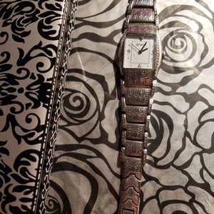 Brighton SUMATRA Bracelet Watch. Runs Wonderfully. Japan Movement. Ornate, Engraved, Silver Plated. Fold-over Clasp Closure. Brand New Brighton Store Installed Battery. In Fair Pre-Loved Condition. Please See All Photos for Measurements and Wear. Included is the Brighton Tin Shown in Photos.