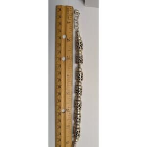 This elegant Brighton bracelet features a unique scrollwork design on barrel-shaped beads, interspersed with smooth rounded silver-tone spacers. Crafted with attention to detail, the intricate filigree-like pattern adds a touch of vintage-inspired artistry and sophistication. The silver-tone metal complements a wide range of outfits, making it a versatile accessory for everyday wear or special occasions.