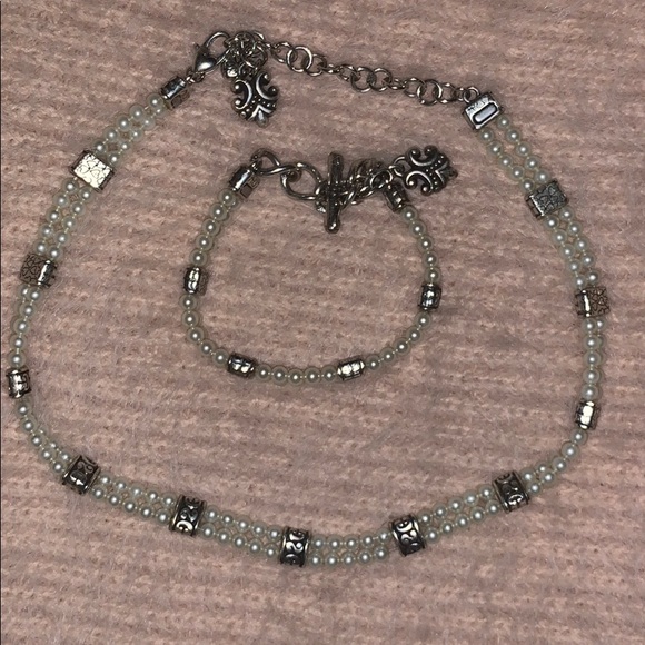 Pearl and silver beaded bracelet and necklace choker set. Sits higher up on the neck.