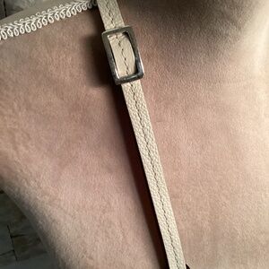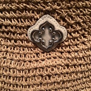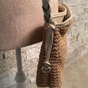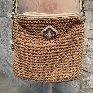 This pretty bag is a Brighton Shelby woven straw or crochet crossbody or shoulder bag. Brighton is known for their handcrafted straw and leather bags, often featuring custom hardware and unique charms. The main body is hand-woven from paper straw or corn husk, complemented by leather trim and straps. They are also hardware