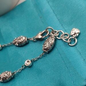 This elegant Brighton bracelet features a sophisticated silver finish with ornate filigree detailing on oval-shaped beads. The addition of sparkling crystals enhances its vintage charm, making it a timeless accessory. Its delicate chain links and secure closure offer both style and comfort.
