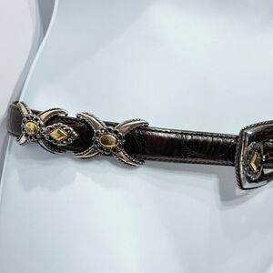 Brighton Silver Buckle Dark Brown Leather Western Belt Women's Size M (30). Nice pre-owned condition. Thank you!