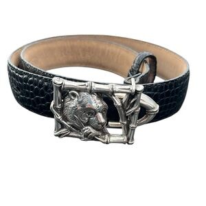 Stylish black crocodile embossed belt featuring a striking silver panda buckle. Perfect for adding a bold touch to any outfit.