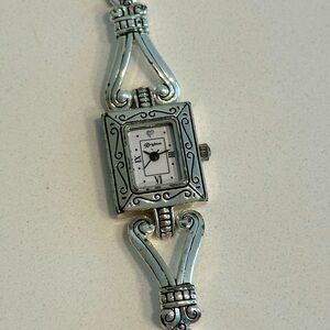 Stylish Brighton watch with a silver chain design. Comes in a colorful decorative tin and original packaging. Please see pictures for wear. Working with battery. Original owner