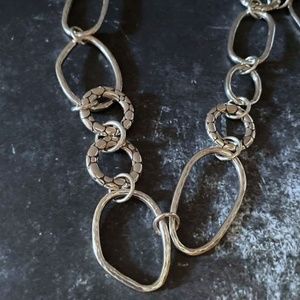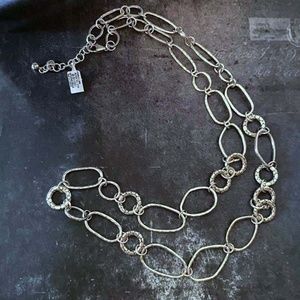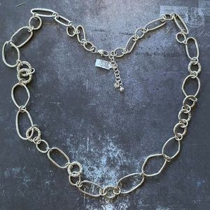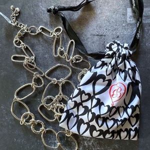 This is a Brighton Silver Plated Necklace. It is 36" long and has a 2" adjustable chain. It has a variety of open chain work, some with a hammered finish and some with pebble details. Could be worn as a necklace or belt! Comes in a nice Brighton drawstring bag with heart design.