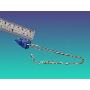 Silver plated chain with a silver plated Toledo bale atop a genuine blue quartz heart pendant
