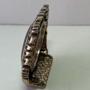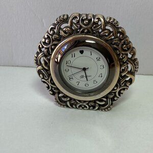Keywords: Brighton clock, silver desk clock, vintage style clock, decorative timepiece, ornate clock, small desk clock, Brighton collectible, silver frame clock, antique style clock, Brighton home decor