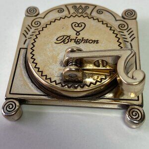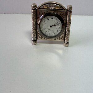 Keywords: Brighton clock, silver desk clock, vintage style clock, decorative timepiece, ornate clock, small desk clock, Brighton collectible, silver frame clock, antique style clock, Brighton home decor