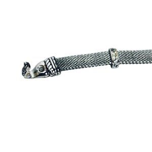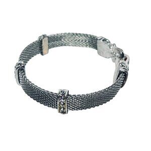 This Brighton bracelet exudes a timeless elegance with its silver-tone mesh design and sparkling rhinestones. The magnetic fold-over clasp ensures secure wear. Its intricate details and vintage charm make it a distinguished accessory. Housed in a decorative velvet pouch, it is a classic piece that complements any collection.