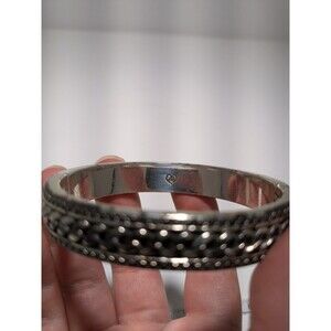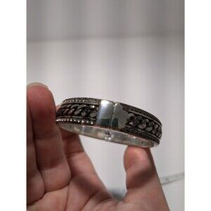 Brighton Silver tone hinged bangle bracelet with woven knot pattern. The bracelet is in good used condition with some tarnish around the edges and hinges.