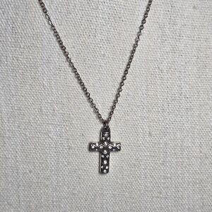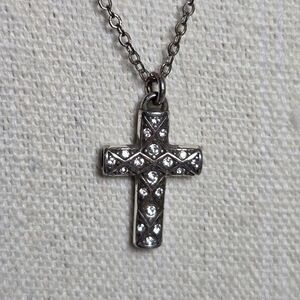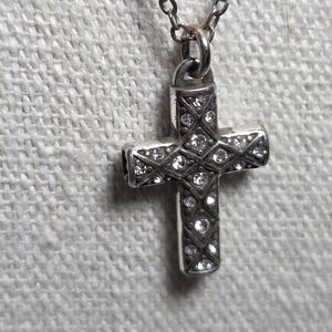 This elegant Brighton necklace features a stunning silver-tone cross pendant adorned with sparkling crystal pave accents. The intricate design on the cross adds a touch of sophistication, making it a versatile piece for both everyday wear and special occasions. The pendant hangs from a classic link chain, completing this beautiful and meaningful accessory.