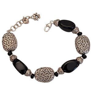 This Brighton Black Glass Bracelet is a great piece to wear day to night--alone or stacked with others. It features an embossed ornate detailing on the silver pieces and glossy finish black glass attached alternately. This bracelet measures 8.25 inches in total length with 4 4-inch chain extensions for an adjustable fit. It has a chunky heart metal tag stamped B, Brighton's markings on one end, and on the other end is a lobster claw closure.