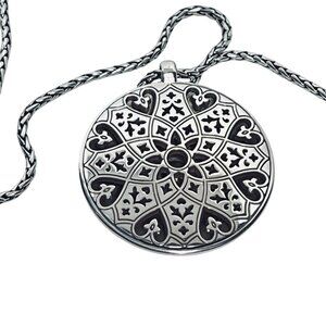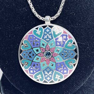 This exquisite Brighton necklace exudes a vintage charm with its intricate enamel design and sparkling blue rhinestone centerpiece. The silver-tone wheat chain adds a classic touch to the overall look, making it a timeless piece that effortlessly blends elegance and style. Ideal for those who appreciate detailed craftsmanship.