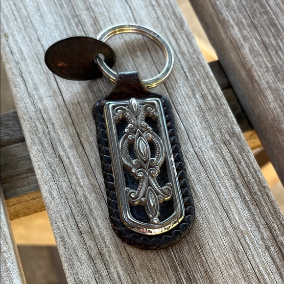 Elegant key holder with intricate silver design. Features a sturdy brown leather base. Perfect for organizing keys with style.