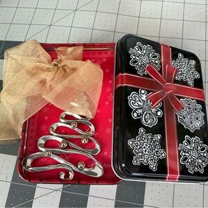 Stylish silver tree ornament with gold accents. Includes a festive red gift tin.