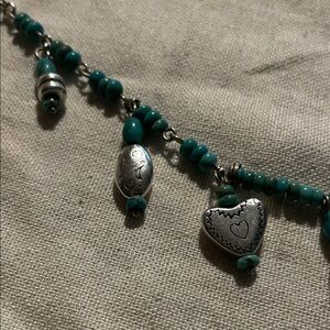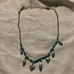 Charming silver necklace with turquoise beads. Features heart-shaped charms. Perfect for adding elegance.