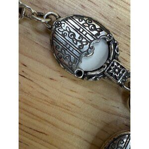 This bracelet features intricate locket-style charms with baby-themed designs, a secure heart clasp, and a silver-tone finish. Ideal for keepsake memories.