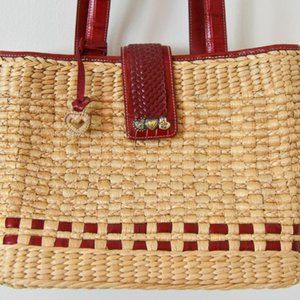 Brighton Straw Satchel with Red Leather Red Leather Handles and buckle with magnet Cute heart details and leather weaving on buckle Woven Straw Clean Lining is clean Good Medium-sized bag Apologies for the dark photo of the inside, my camera was too large to fit.