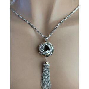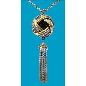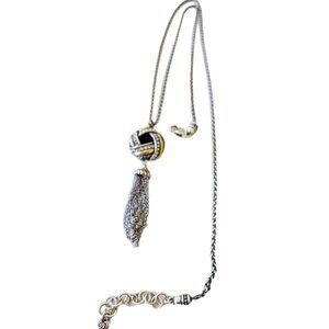 Long Tassel Necklace is a woven link design measuring 32"-36" adjustable with a lobster claw clasp closure and features a tassel accented pendant with a 3 1/2" drop.