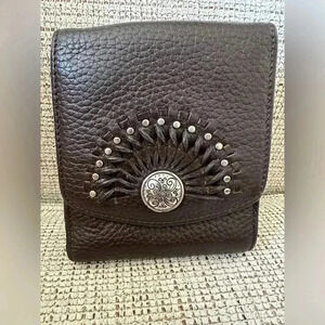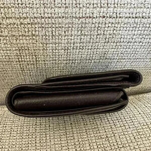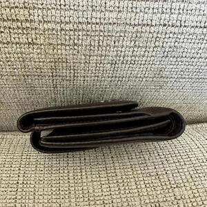 14 credit card slots and one clear slot for an ID. Two compartments for cash and receipts. Magnetic snap closure. Additional compartment with snap closure. Leather is buttery soft. Beautiful decor with some minor wear on the exterior silver, please see pics.